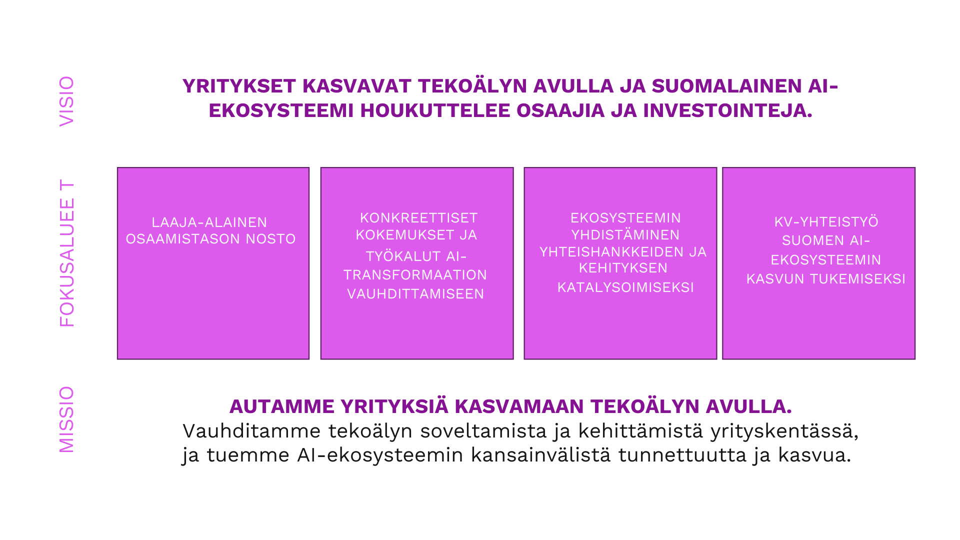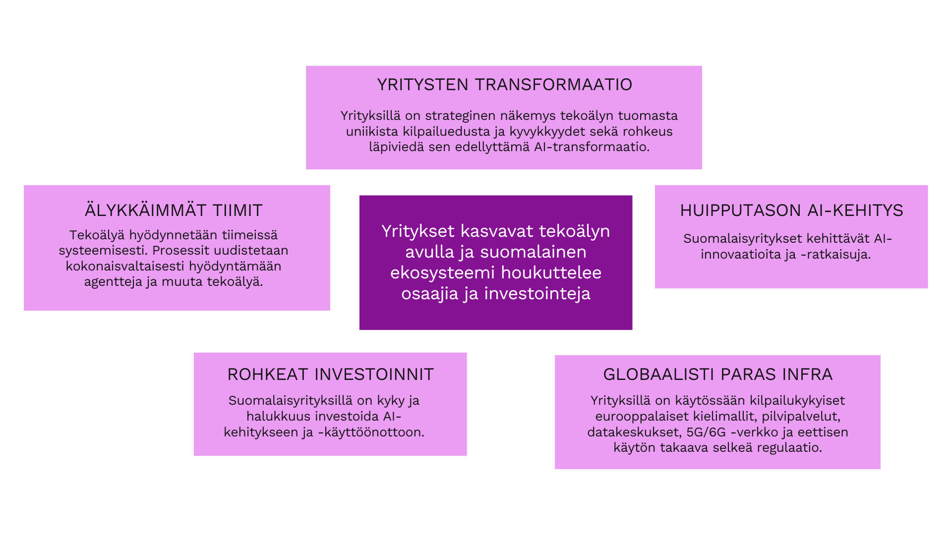 Kuva 1: AI Finlandin visio ja sitä tukevat strategiset teemat.