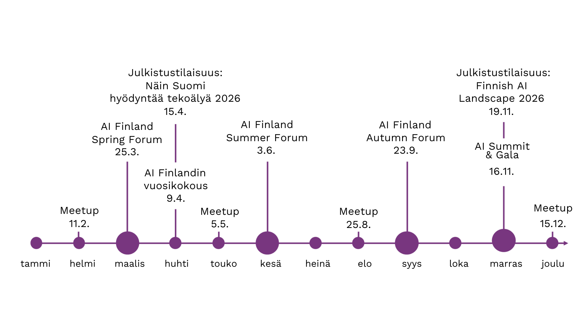 Rajalliset resurssit on käytettävä strategisesti. Vuonna 2026 AI Finland siirtyy palvelemaan jäsenistöään jatkuvalla, tekoälyn mahdollistamalla mallilla. Päätapahtumia järjestetään vain neljä, mutta niiden jokainen yksityiskohta on tarkkaan kuratoitu ja ne tuovat koko jäsenistön yhteen. Ensi vuonna myös pohjoismaisen ekosysteemin mahdollisuudet konkretisoituvat.