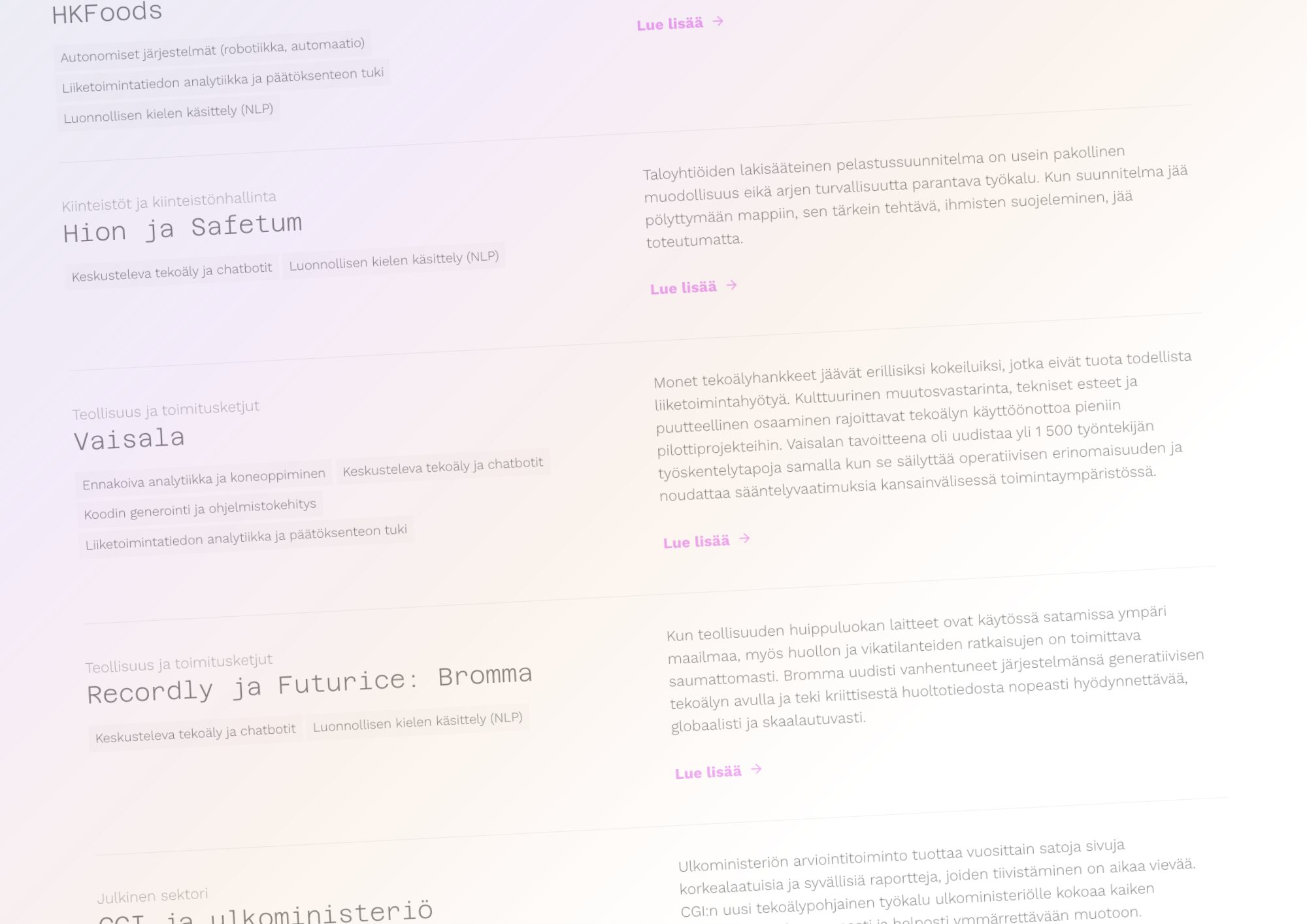 AI Finlandin käyttötapauskirjasto on avoin, keskitetty digitaalinen alusta, joka kokoaa yhteen konkreettisia tekoälyn sovellusesimerkkejä eri toimialoilta. Kirjasto toimii tiedonjakamisen ja oppimisen foorumina yrityksille, tutkijoille ja päätöksentekijöille – tuoden esiin, miten tekoälyä hyödynnetään käytännössä kilpailukyvyn, tehokkuuden ja innovaation edistämiseksi.
