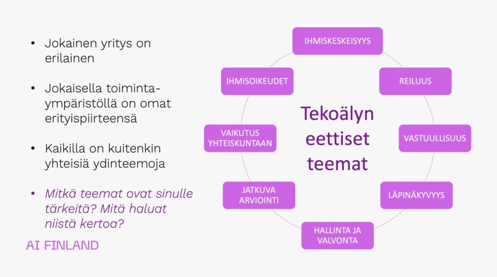 AI Finlandin tekoälyregulaatioon keskittyvä työryhmä on työskennellyt puoli vuotta jakaen parhaita käytäntöjä ja oppeja tekoälyregulaatioon ja hallintamalleihin liittyvistä teemoista. Tästä kalvosetistä löydät 10.9. järjestetyn vertaissparraus -webinaarin esimerkit eettisten periaatteiden soveltamisesta.