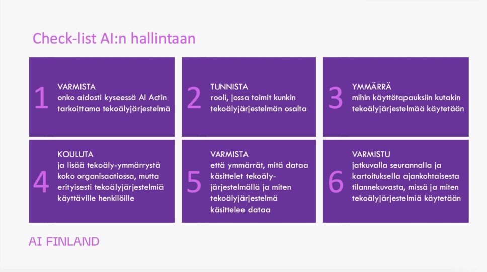 AI Finlandin tekoälyregulaatioon keskittyvä työryhmä on työskennellyt puoli vuotta jakaen parhaita käytäntöjä ja oppeja tekoälyregulaatioon ja hallintamalleihin liittyvistä teemoista. Tämä tiivistelmä on tuotettu 10.9. järjestettyyn vertaissparraus -webinaariin.