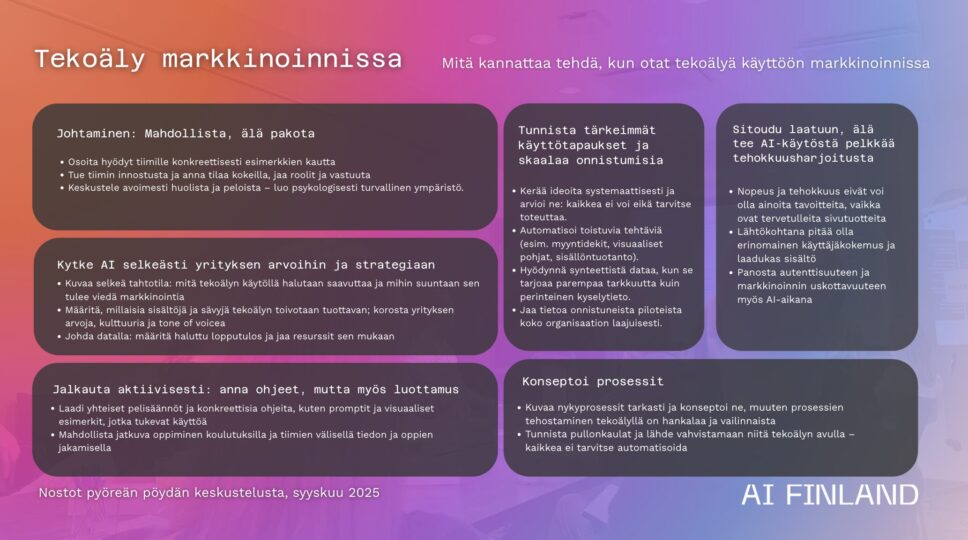 Mitä kannattaa tehdä, kun otat tekoälyä käyttöön markkinoinnissa – ja mitä puolestaan välttää? Tämä huoneentaulu kokoaa yhteen AI Finlandin järjestämän pyöreän pöydän keskustelun opit, joihin osallistui 15 markkinoinnin ja viestinnän asiantuntijaa.