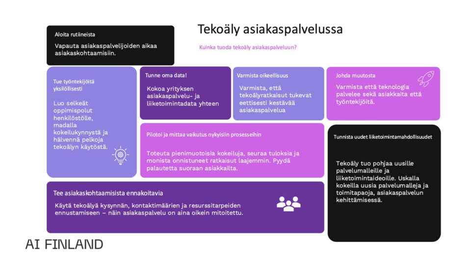 Kuinka tuoda tekoäly asiakaspalveluun? Tämä huoneentaulu kokoaa yhteen AI Finlandin ja Paltan yhteisen asiakaspalvelutyöryhmän opit. Tiivistelmä on tuotettu 1.10. järjestettyyn vertaissparraus -webinaariin.