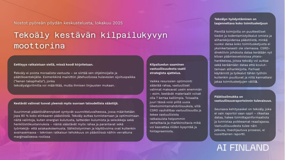 Miten edistää niin kilpailukykyä kuin kestävyyttä? Tämä huoneentaulu kokoaa yhteen AI Finlandin järjestämän pyöreän pöydän keskustelun opit, joihin osallistui 18 asiantuntijaa.