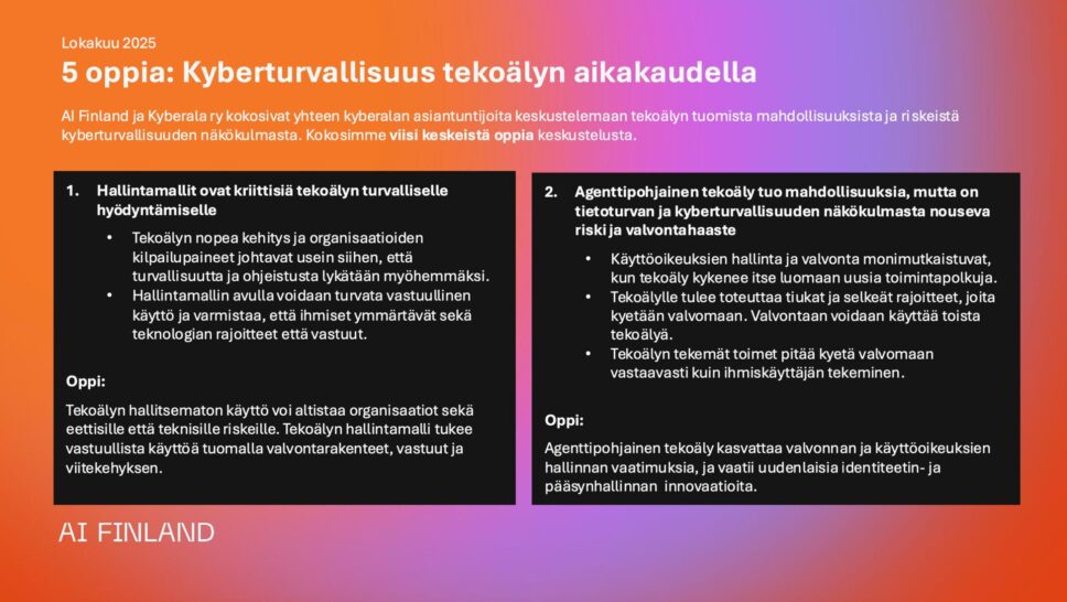 AI Finland ja Kyberala ry kokosivat yhteen kyberalan asiantuntijoita keskustelemaan tekoälyn tuomista mahdollisuuksista ja riskeistä kyberturvallisuuden näkökulmasta. Kokosimme viisi keskeistä oppia keskustelusta.