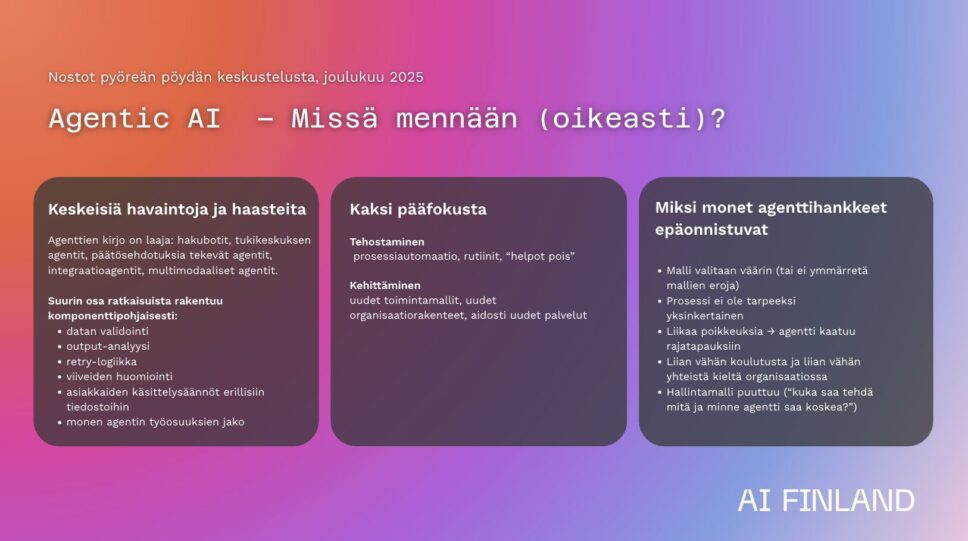 Agentic AI – Missä mennään (oikeasti)? Tämä tiivistelmä kokoaa yhteen AI Finlandin joulukuussa 2025 järjestetyn pyöreän pöydän keskustelun opit.